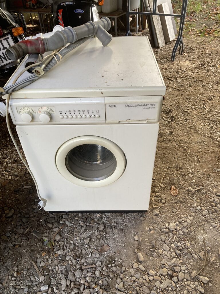 Heute habe ich schon mal die Reservemaschine aus dem Haus geschafft. Schwer ist das Ding. Die Sackkarre und vor allem ich hatten alle Hände voll zu tun. Echt! „AEG Ökolavamat 925 sensortronic“. Verdächtig kleines Bullauge. 5 Kilo-Trommel. Hui, zeitgemäß. Heute ist 8 Kilo standard und unsere „neue“ wird 9 Kilo haben. Ich muss neu lernen, dass Zeit rennt und Dinge die einen Gebrauchswert haben oder hatten, diesen zu einem bestimmten Zeitpunkt einfach nicht mehr haben. Punkt. Ergo=Elektroschrott. Punkt.Punkt.Punkt.